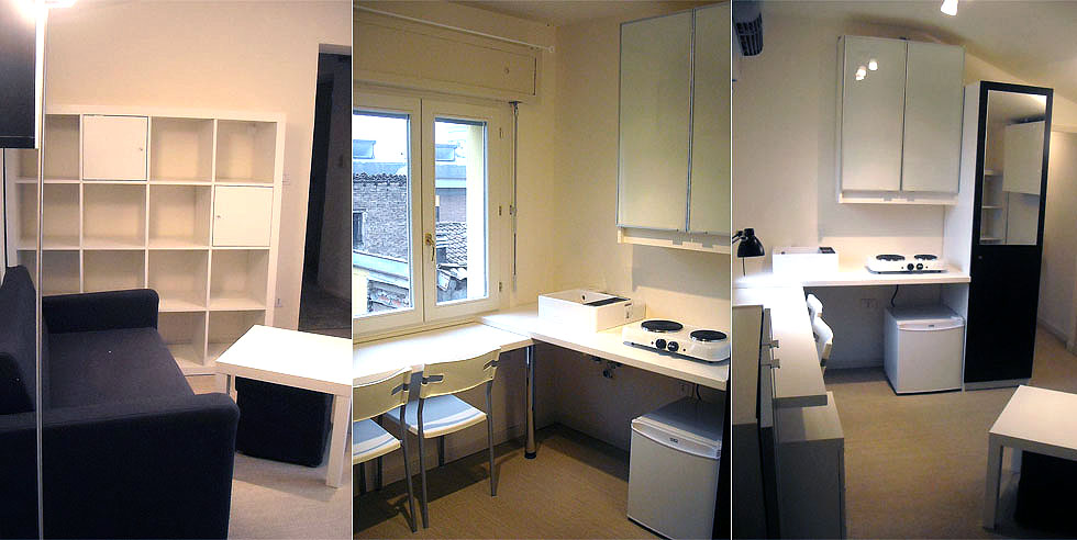 Situato nel cuore del Centro questo monolocale x studenti svetta sui tetti di Modena. A terra è posato un tatami color sabbia e l'arredo è completamente a basso costo. Divano letto, angolo cottura. Tavolo angolo studio, tutto rigorosamente ikea. Il bagno in mosaico è dotato di una grande doccia con vista panoramica. |